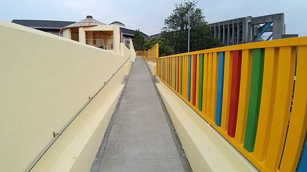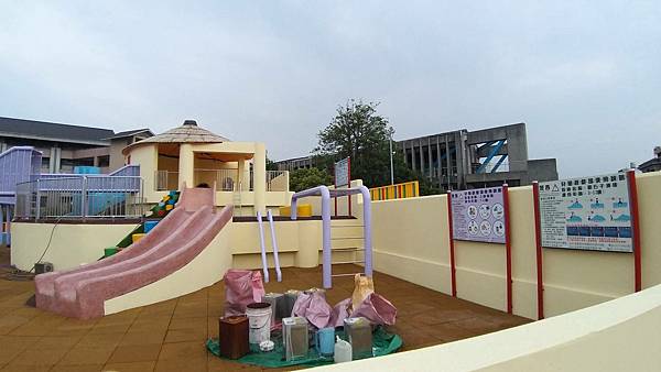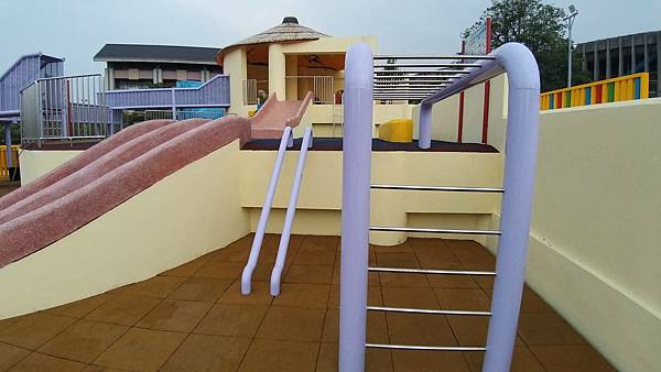 第二層有磨石子溜滑梯(3歲~12歲)及上肢單槓(7歲~12歲))的設施